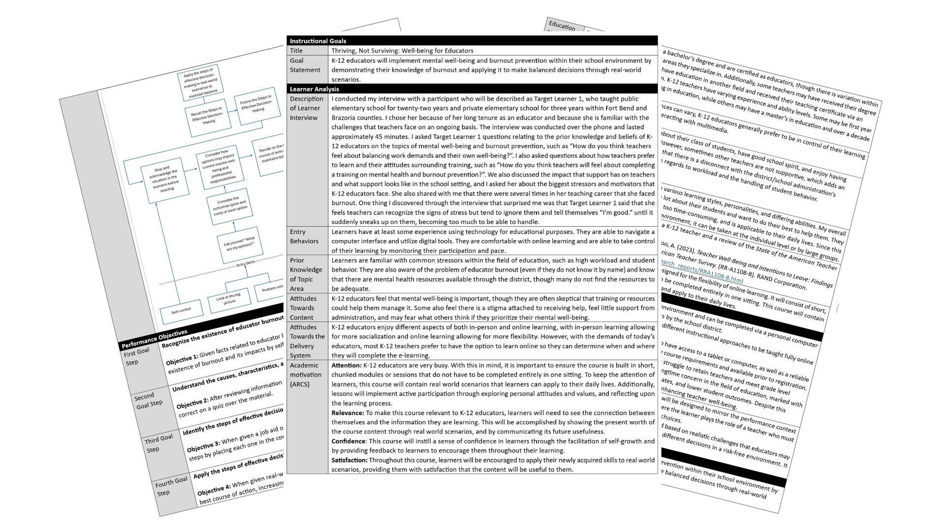 For this project, I acted as the SME, drawing from my experience in education and social work. I began by conducting learner and context analyses to understand my audience, as well as their work and learning environments. Using this information, I created goals and performance objectives and focused on identifying the actions the learner would need to perform. Then, I developed the instructional strategy, using insights from Keller’s ARCS model and Gagne’s nine events. Through each step of the instructional design process, I compiled information in a design document, which served as the blueprint for this project.
