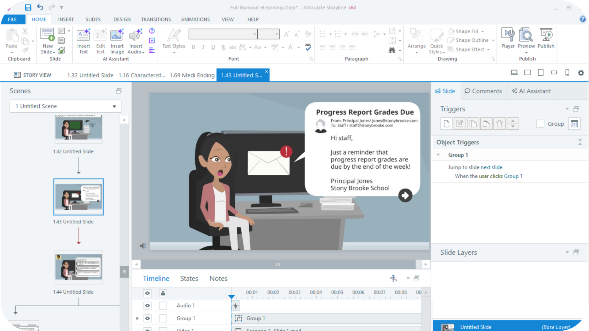Once the mockups were complete, I created an interactive prototype of the scenarios in Articulate Storyline. Using Vyond, I carefully crafted animations, characters, and backgrounds that I used to immerse learners into the story. I used the animations to show the emotions of the characters and mirror a real-world school environment.